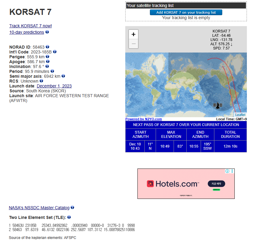 0.0022186 (소수점 앞에 .이 생략됨) ⟶ 거의 원에 가까운 궤도35-42 252.5687 Argument of Perigee 근지점 인자 (omega): 적도에서 근지점까지의 각도. 44-51 107.3112 Mean Anomaly 평균 근점 이각 (M): TLE 기준 시점에서의 위성 위치 (각도). 53-63 15.00878825 Mean Motion 평균 운동 (n): 위성이 하루에 지구를 도는 횟수 (15.00878825 궤도/일) 64-68 110886 Revolution No. TLE 기준 시점까지의 누적 공전 횟수입니다. 69 6 Checksum 데이터 무결성 검증을 위한 체크섬 (계산에 사용되지 않음)