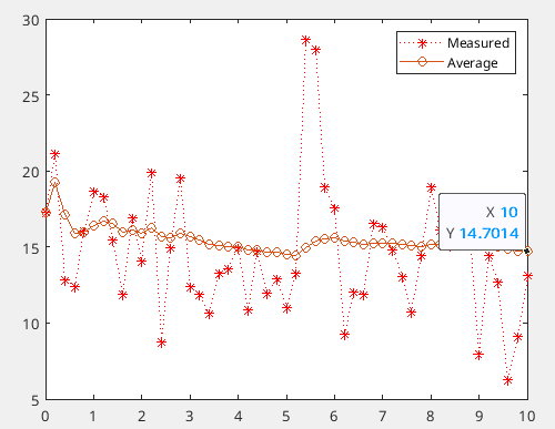 측정값은 표준편차 4의 노이즈 때문에 계속 요동치지만, 평균은 0이므로 참값(약 14.4 근처)으로 수렴한다.