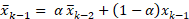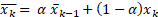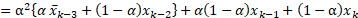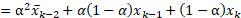 식 3 k번째, k-1번째, k-2번째에 곱해진 식을 비교하면 어느 데이터에 가중치가 많이 부여되어 있는지를 알 수 있다. α가 0과 1사이의 값이므로 α(1- α)와 (1-α) 계수의 관계식을 구할 수 있다.