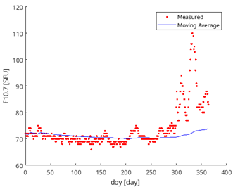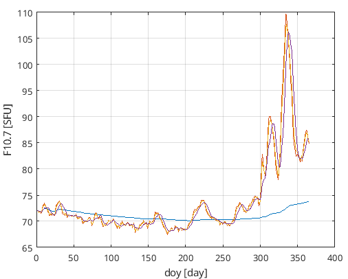 clear all; figure; set(gcf,'Color','w'); %dir : listup file or directory as structure file_info=dir('res_*.txt'); colors = lines(4); for i = 1:4 file_path = file_info(i).name; data = readmatrix(file_path); t_data = data(:,1)+1; filtered_data = data(:,3); plot(t_data, filtered_data, 'Color',colors(i,:),'LineWidth',1.5, 'DisplayName',file_path); hold on; end measured_data = data(:,2); plot(t_data, measured_data, 'r.'); grid on xlabel('doy [day]'); ylabel('F10.7 [SFU]'); legend('Filter1','Filter2','Filter3','Filter4','Measured','show', 'Location','best');dir은 현재 폴더에 있는 파일과 폴더를 나열하는 함수이다.