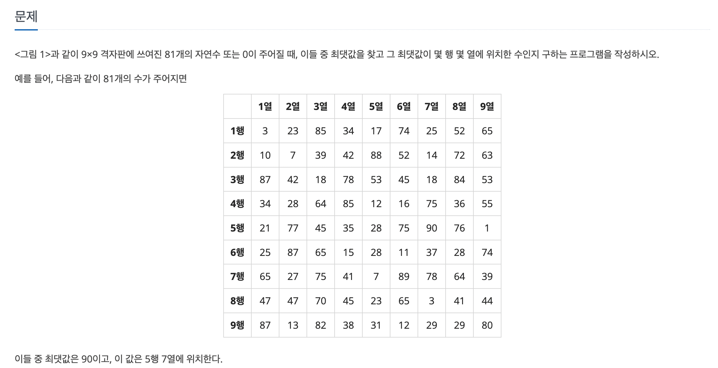 1. 문제 2566번: 최댓값 첫째 줄에 최댓값을 출력하고, 둘째 줄에 최댓값이 위치한 행 번호와 열 번호를 빈칸을 사이에 두고 차례로 출력한다. 최댓값이 두 개 이상인 경우 그 중 한 곳의 위치를 출력한다. www.acmicpc.net 헉 ,, 싶지만 원소 하나하나 탐색하면서 풀어본다 .. ! 그런데 2차원 리스트 입력받는 법이 뭐더라 ? 2. 배경지식 [2차원 리스트] 2차원 리스트는 리스트 속에 리스트가 들어있다고 생각하면 된다. 도식화 해보면 1차원 리스트가 줄이라면 2차원 리스트는 표(1열 표,1행 표 제외)이다. 1차원 리스트 list_1d=[0,1,2,3,4,5,6,7] 0 1 2 3 4 5 6 7 2차원 리스트(3행 5열) list_2d =[[0,1,2,3,4],[a,b,c,d,e],[ㄱ,..