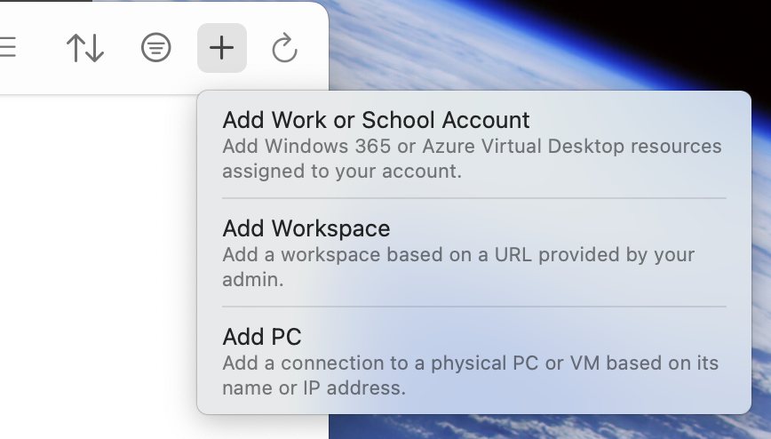 Windows App을 실행하고, 화면 상단 + 버튼 > Add PC를 누른다.