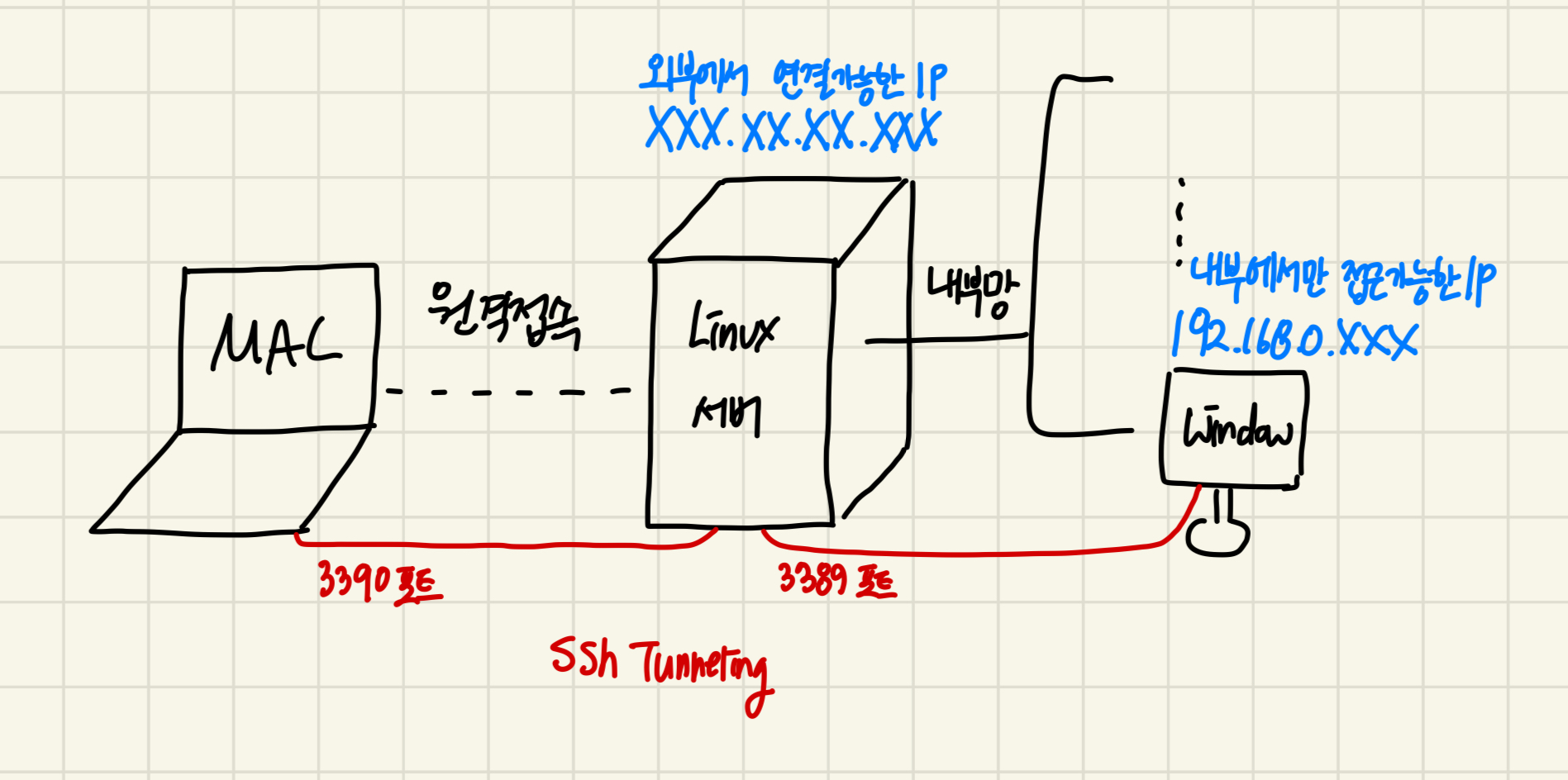 그리고 내가 접근해야하는 Windows는 Linux서버에 연결된 내부망을 사용하기 때문에 Linux서버에 원격접속한 다음, 터널링을 통해 접근해야한다. 그래서 접근하고자 하는 경로가 MAC → Linux서버 → Windows 으로 연결된다.
